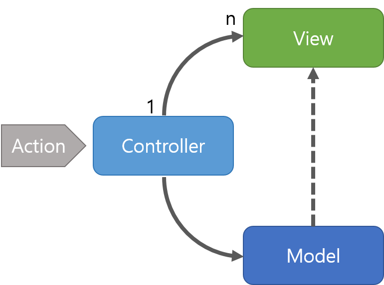 더불어 Controller는 여러 개의 view를 선택할 수 있는 1 : N 구조이지만, 단지 선택만 진행할 뿐...! 직접 업데이트를 하지는 않는다.