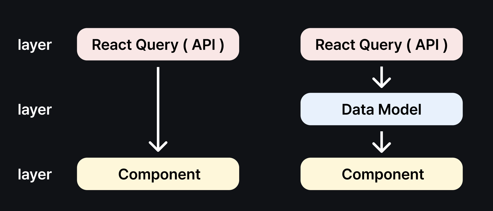 좌측처럼 layer를 2개의 계층으로 가진 경우에는 디자인이 변경되지 않더라도, API의 변경사항이 발생하면 component도 함께 수정해야 하는 과정이 생길 것이다.